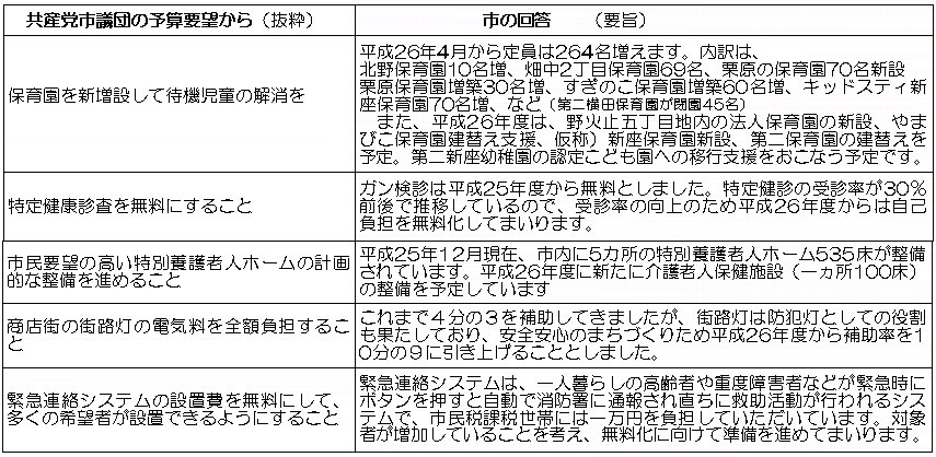 また、保育園は定員を264名増やす。特定健診を無料化する。商店街の街路灯助成の改善などの回答がありました。