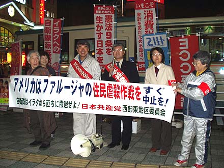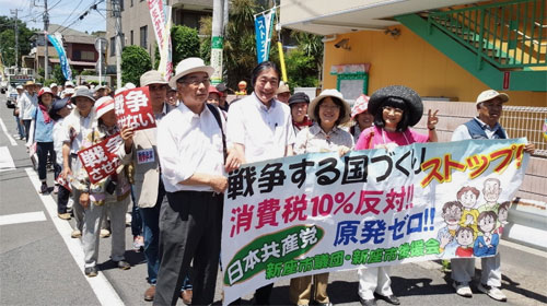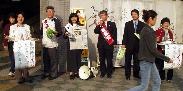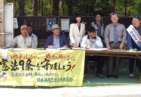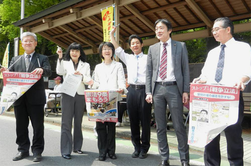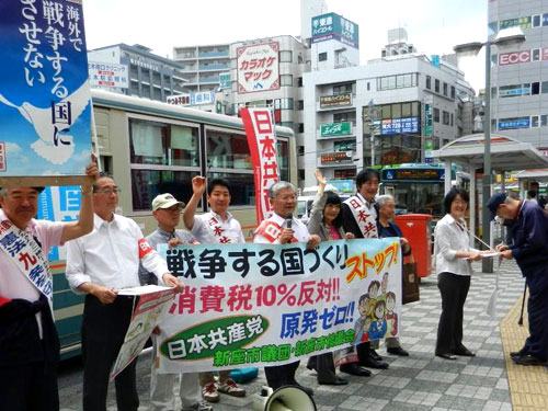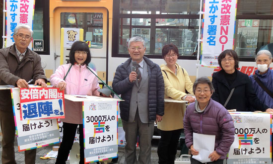 | 党市議団と地域の人たちが元気に参加。「若者を戦場に送るな」と市民の方々に訴えました。「絶対に戦争はいやだ」と、短時間に124筆の署名が集まりました。 |