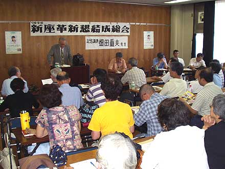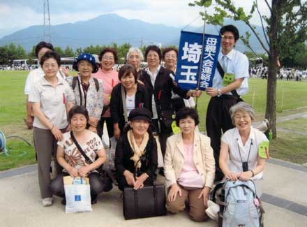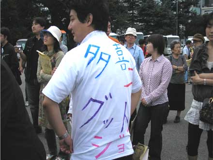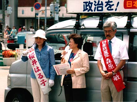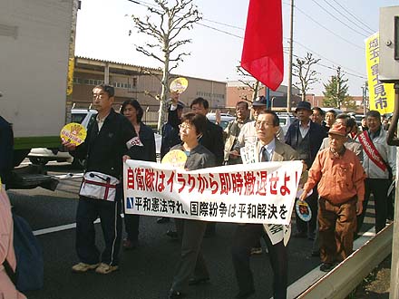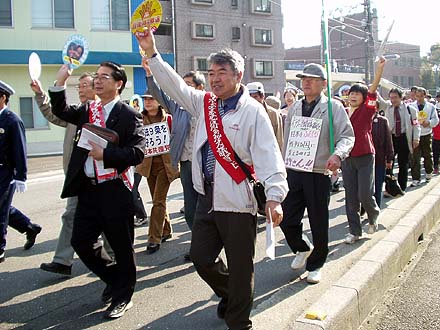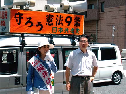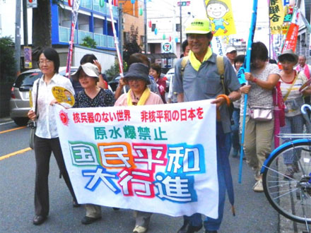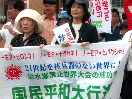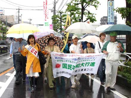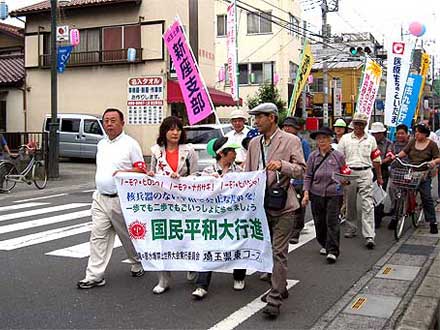 | 被爆60年、戦後60年の今年。核兵器の廃絶にも大きな節目の年にしたいと行動しています。(原水爆禁止世界大会の成功求める国民平和大行進にて。正面は党代表で挨拶したあやべ澄子氏) |