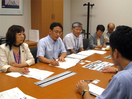 | 党新座市後援会45名は、安倍政権が衆議院での強行採決の構えを見せる国会を緊急訪問し、「戦争法案反対署名」2210筆を塩川・梅村両衆院議員に手渡しました。 |