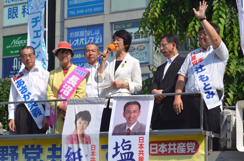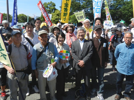 | 「集団的自衛権行使容認の閣議決定撤回を求めるオール埼玉総行動」が行なわれ、北浦和公園は1万人を超える人で埋まりました。新座市からも多数の市民と共産党市議団も参加しました。 |