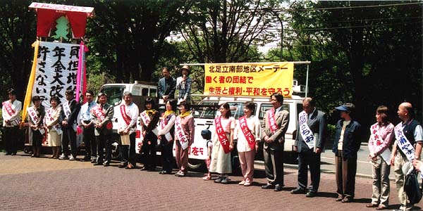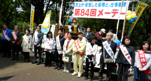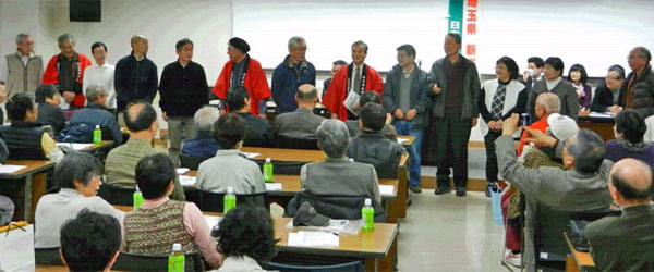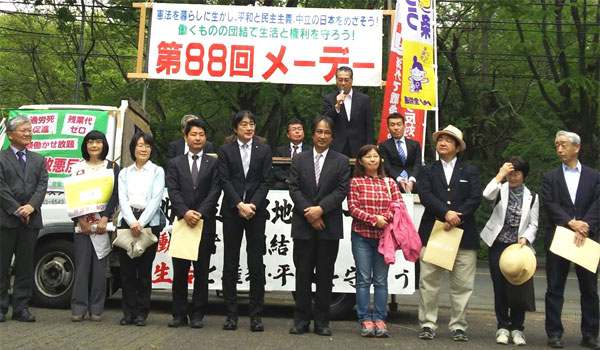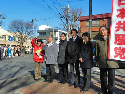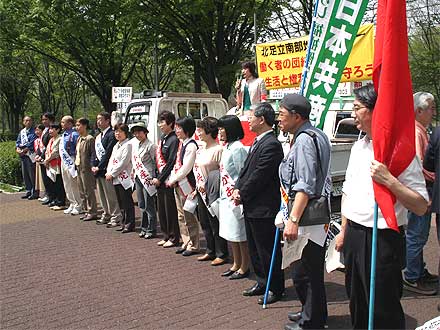 働く者の団結で生活、権利を守ろう。勢ぞろいした17名の4市の共産党市議団。 |