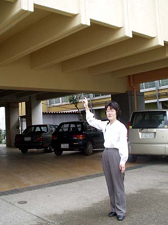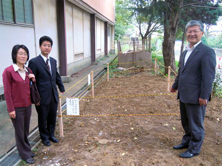| 共産党市議団は小学校を訪ね、高い放射線量の土壌を埋めた場所などを調査。校長先生から「雨どいの下などが高い数値を示した。2ケ所に分けて土壌を埋めた」と説明がありました。 |