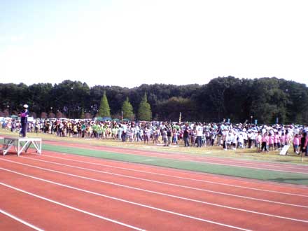 | 秋晴れのもと市総合運動公園に17か所の放課後児童保育室の総勢1800人が集い、保育室ごとに競い合いました。開会式には朝賀、小野両市議が参加し激励しました。 |
