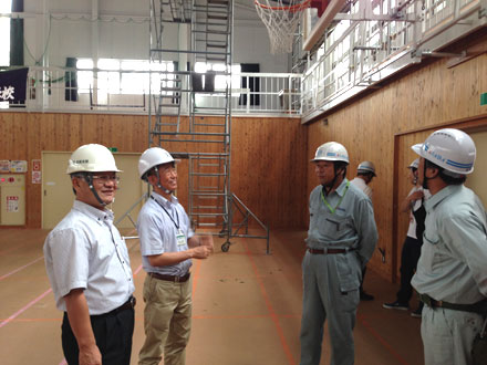 | 埼玉土建労組が新座市公共工事の現場調査を行い、笠原議員、芦野議員も同行しました。現場は第二中学校体育館、第四中学校体育館と武道館の照明器具や窓枠などの耐震補強工事です。 |