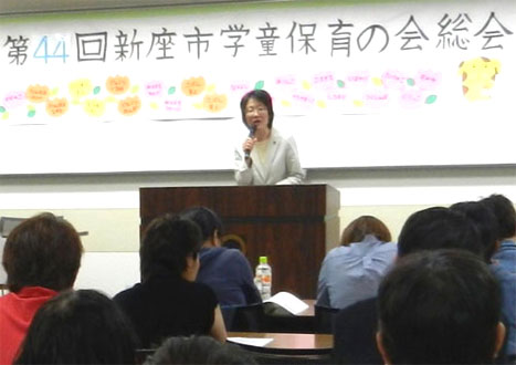 | 新座市学童保育の会総会で石島市議が挨拶。支援員はハードな業務に応募が少なく欠員状態が続いています。待遇改善で、一人ひとりに寄り添える保育にとの熱意が伝わる大会でした。 |