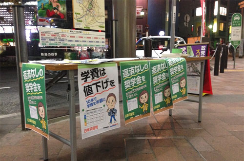 | 新座駅南口で「返済不要の奨学金制度の創設と学費減免を求める署名」宣伝。高学費と奨学金の返済による貧困の連鎖を断ち切るため、より幅広い取り組みが必要です。 |