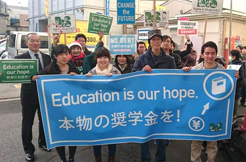 | ”rights to study@埼玉”が呼びかけた行動に小野市議と辻市議が参加。「返済いらない奨学金を」「教育は権利だ」など音楽と太鼓に合わせてシュプレッヒコールをあげて歩きました。 |